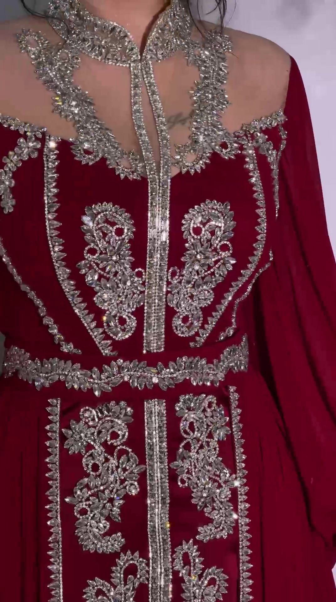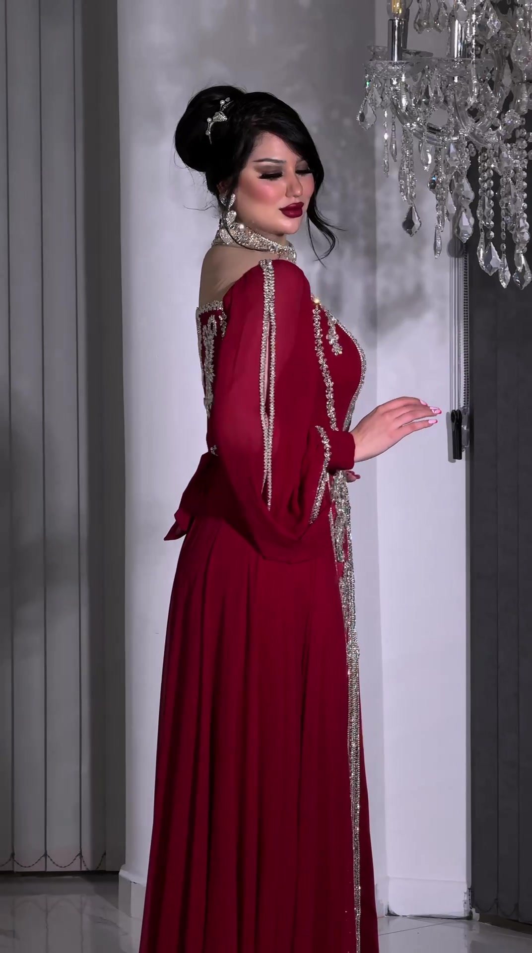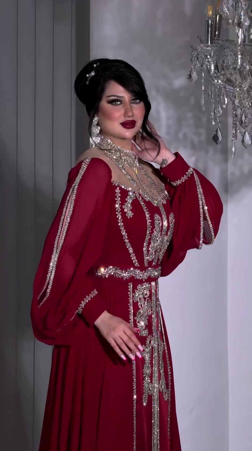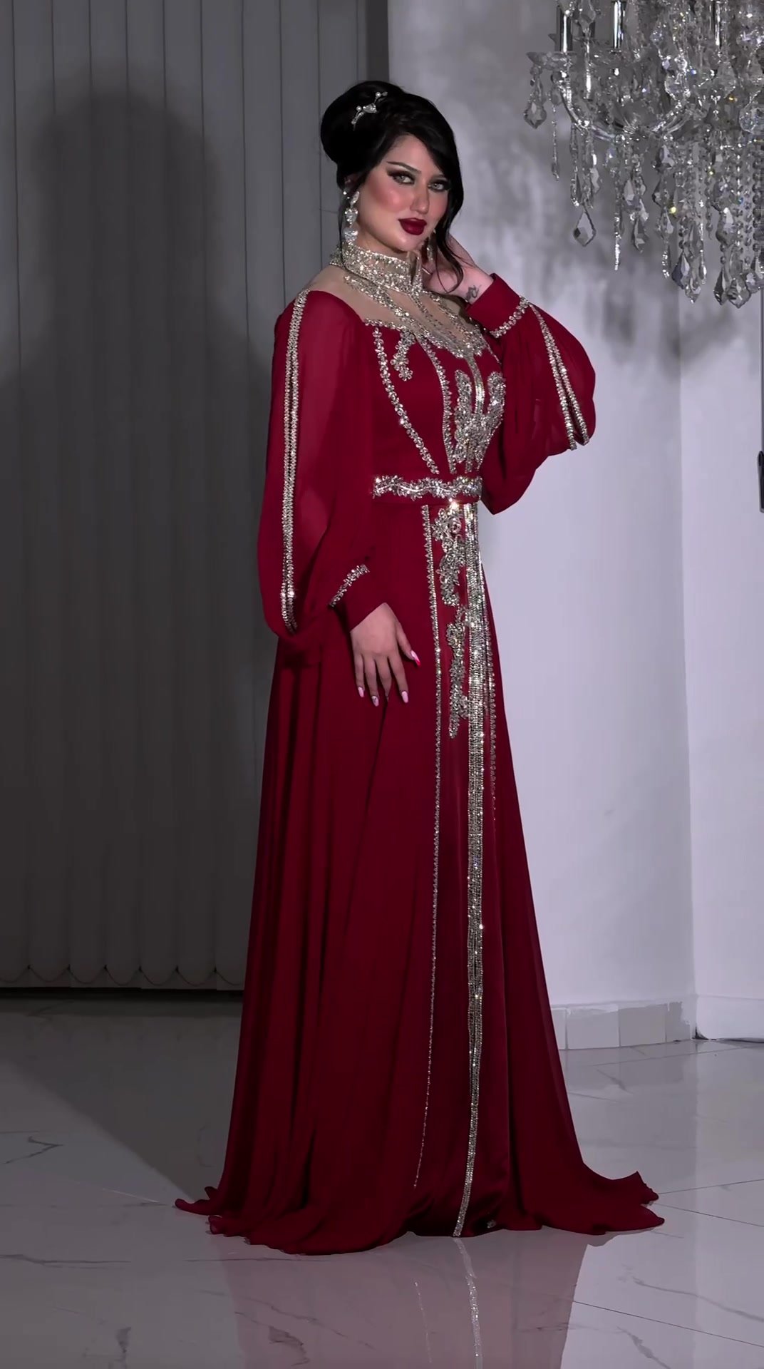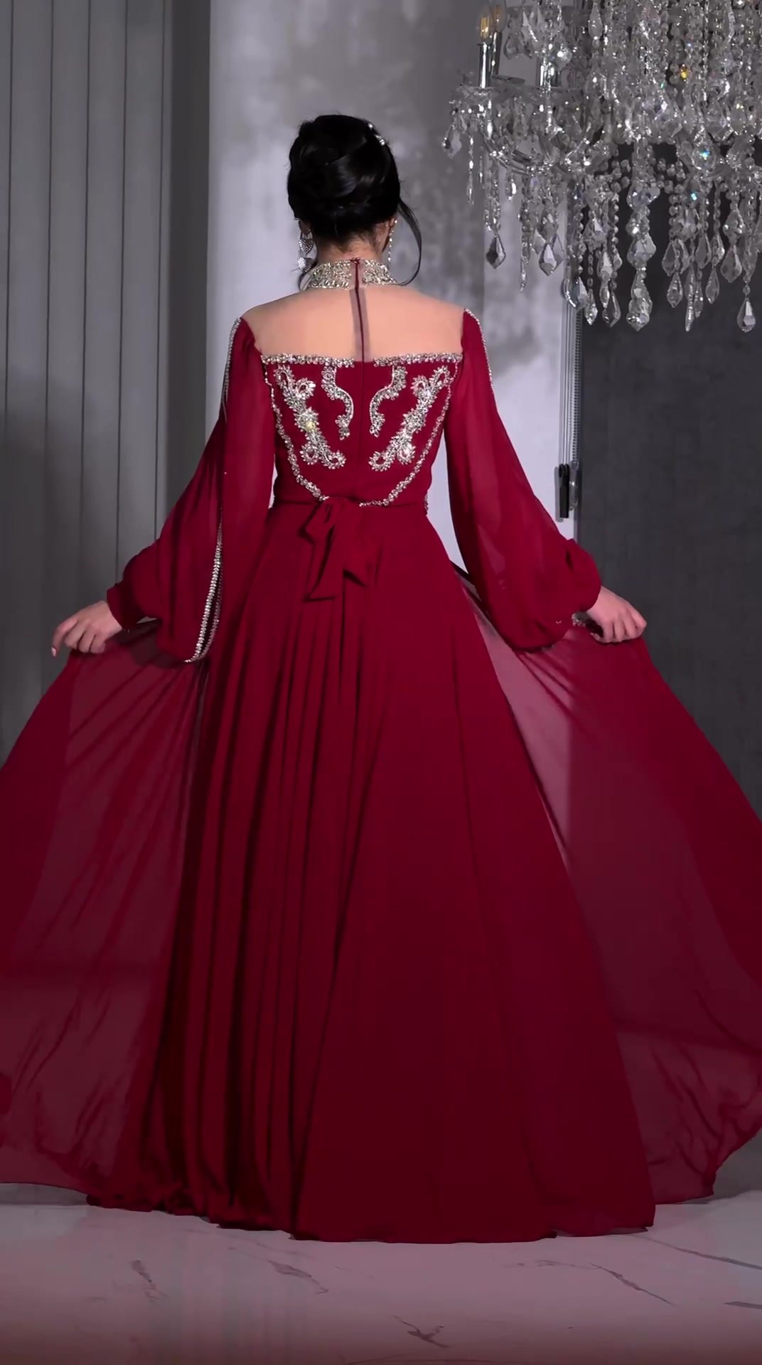 Distinguish yourself with an unforgettable royal look in this sophisticated red gown embroidered with silver, meticulously designed to give you both luxury and femininity. This gown features wide, sheer sleeves that add a soft touch to the design, with a high neckline fully embroidered with sparkling crystal, and a wonderful fluidity of the fabric that reflects luxury in every movement.