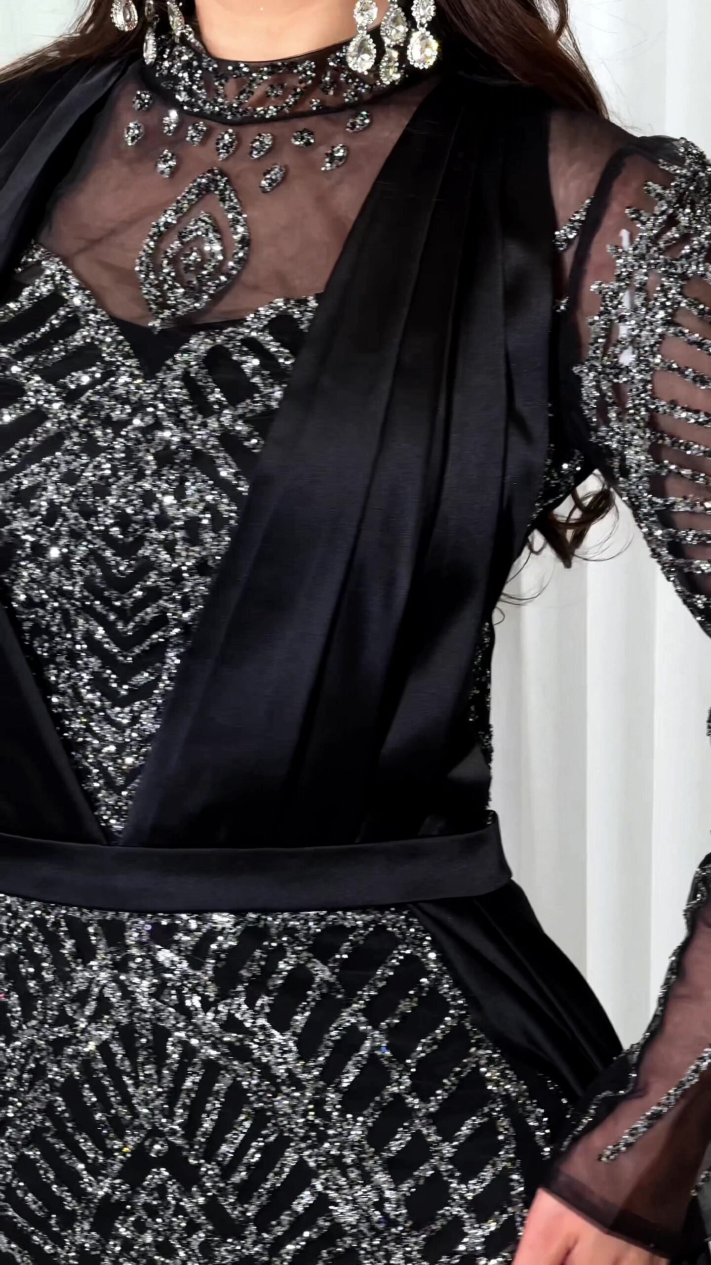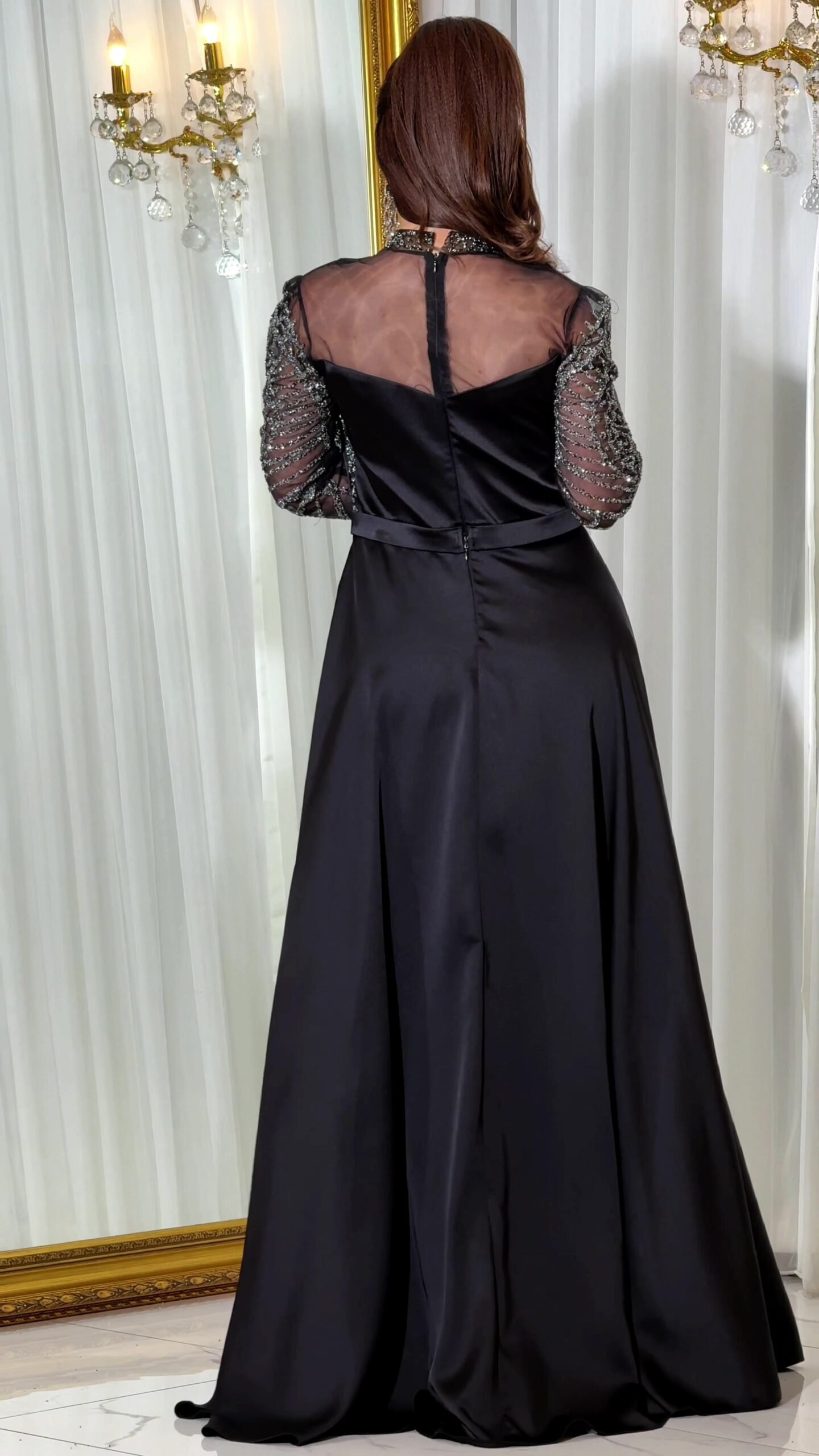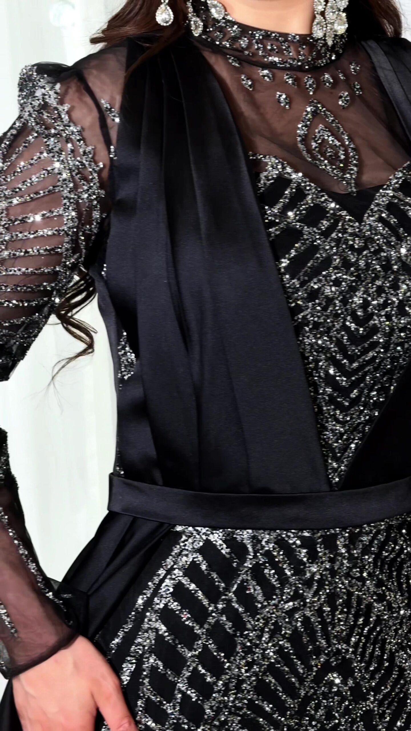 Get ready to shine with unparalleled elegance in this sophisticated gown, specially designed to highlight your beauty on the most important occasions. It features a slim-fit cut with luxurious embroidery of beads and sparkling crystal that covers the entire front and the sheer sleeves, in a unique geometric design that combines modernity and sophistication.