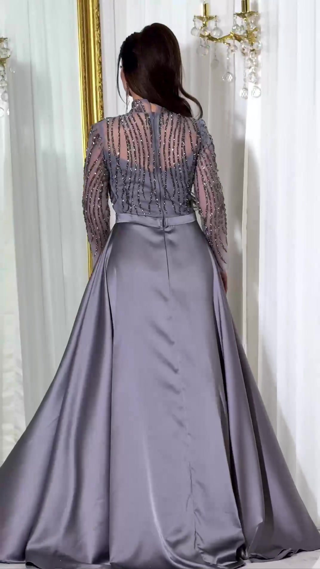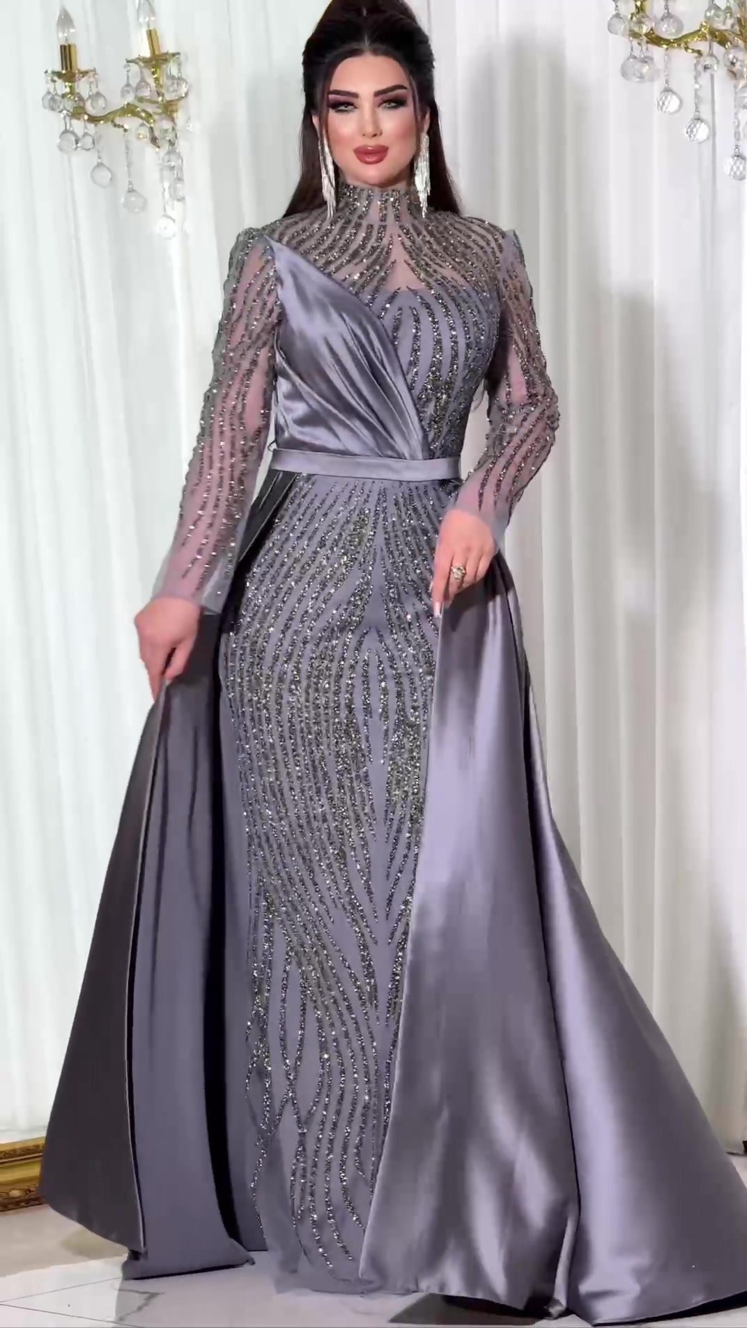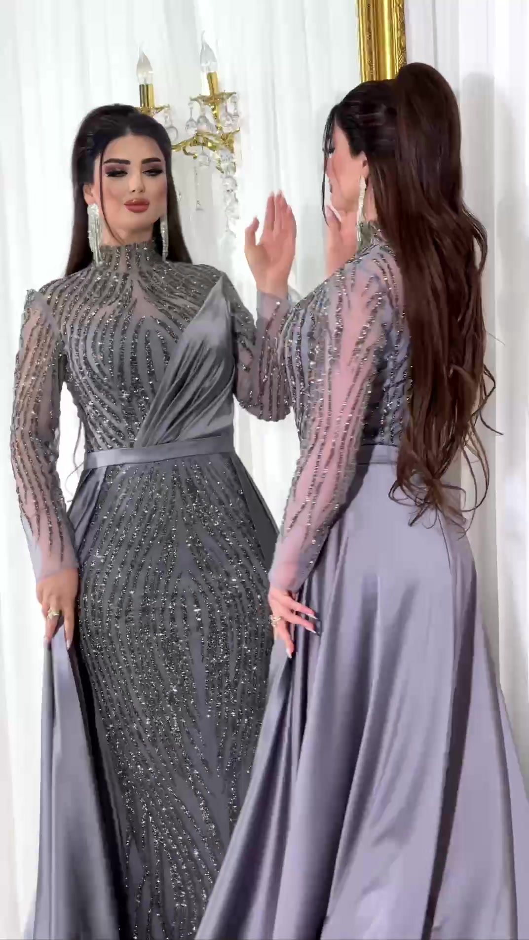 The long, sheer embroidered sleeves, along with the high neckline and defined waist cut, create a perfect balance between elegance and sophistication. Perfect for weddings, formal occasions, engagements, or special evening soirées.