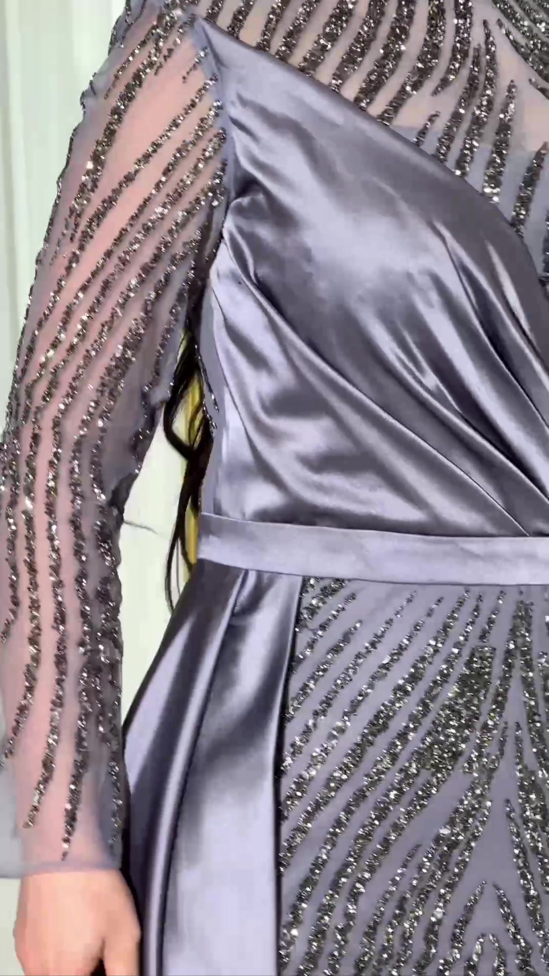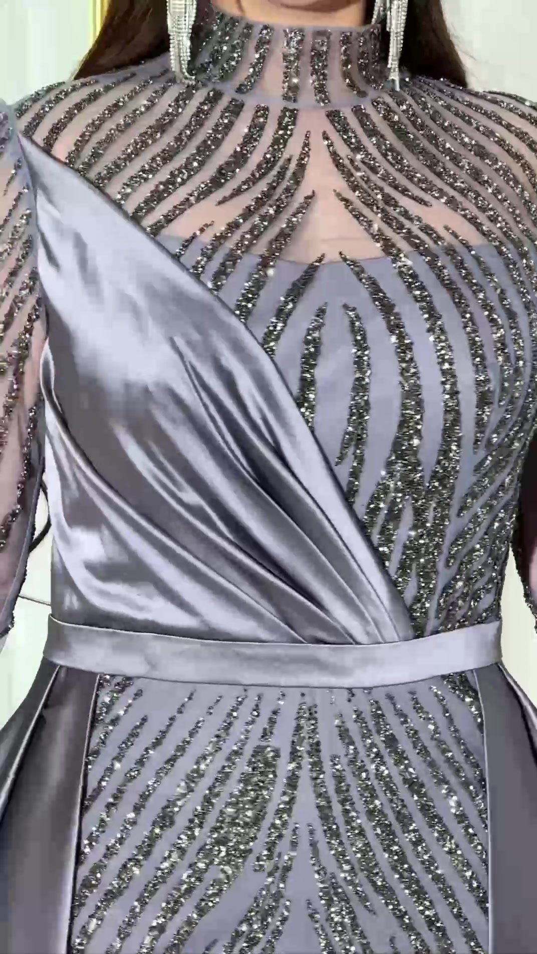 Elevate your look to the highest levels of luxury with this elegant silver gown, designed with sophisticated embroidery that cascades in lines of sparkling diamonds, giving you an attractive shimmer under the light.
