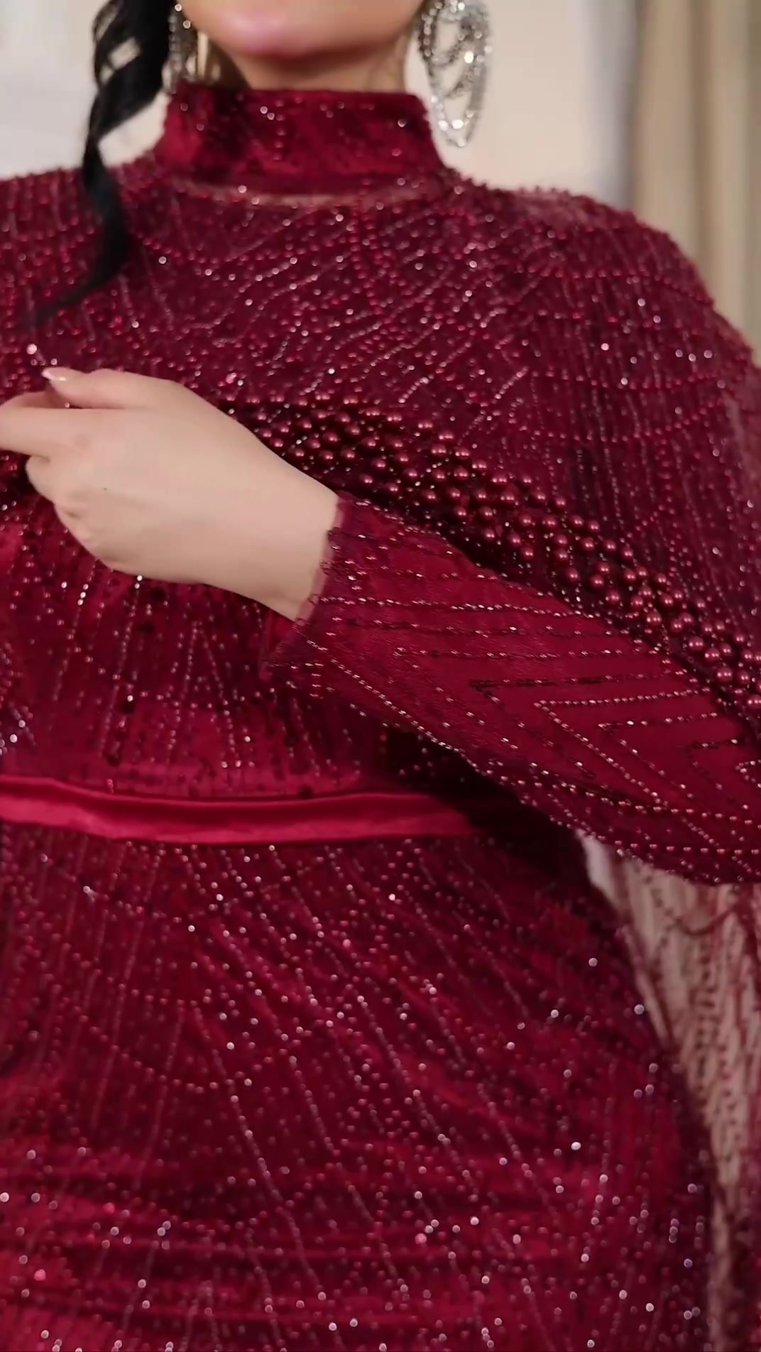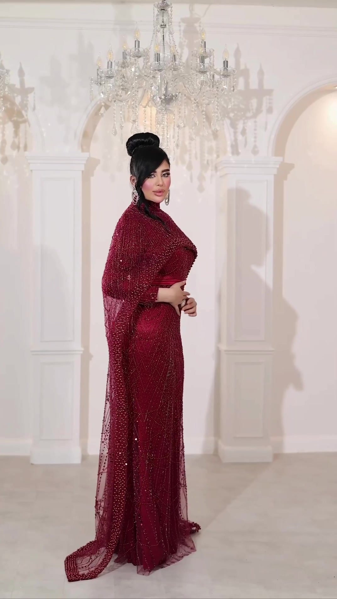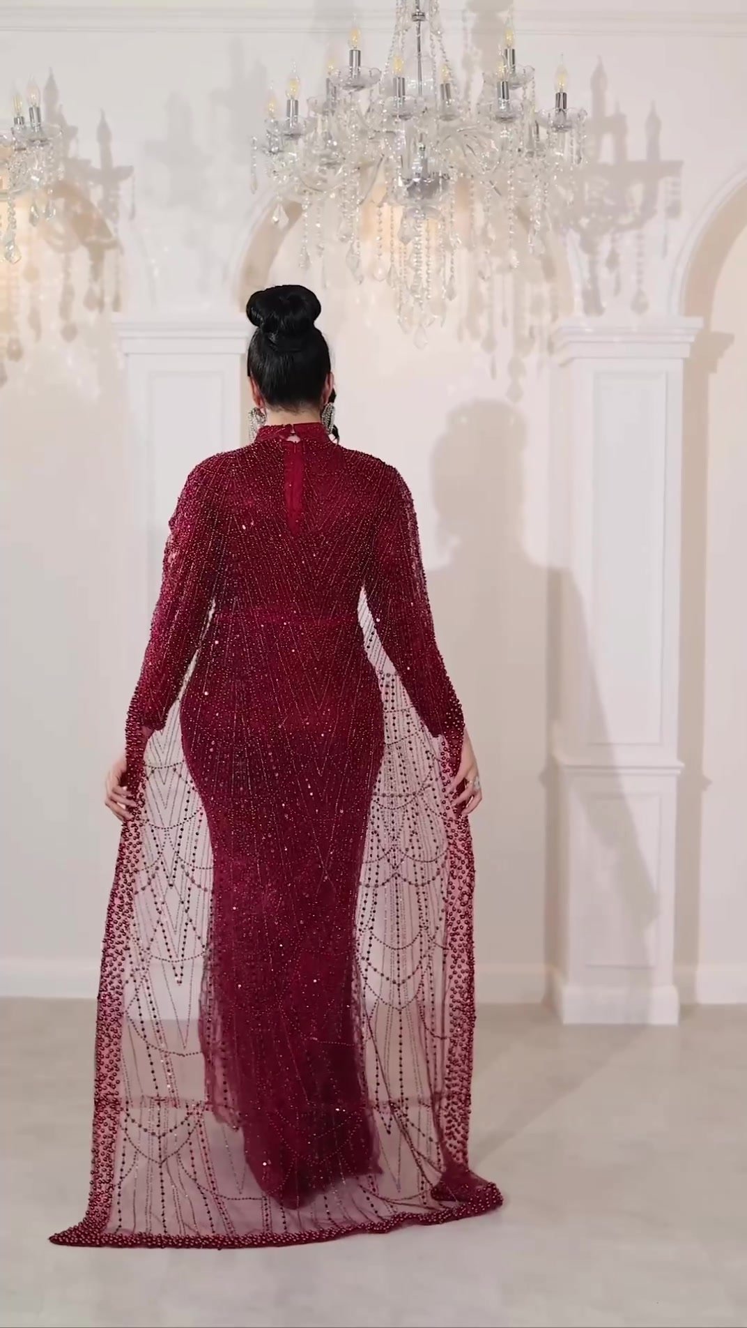 The bodice is closed with a high collar for a sophisticated look, while the sheer sleeves draping from the shoulders create a soft cape, giving you a regal presence at every occasion.