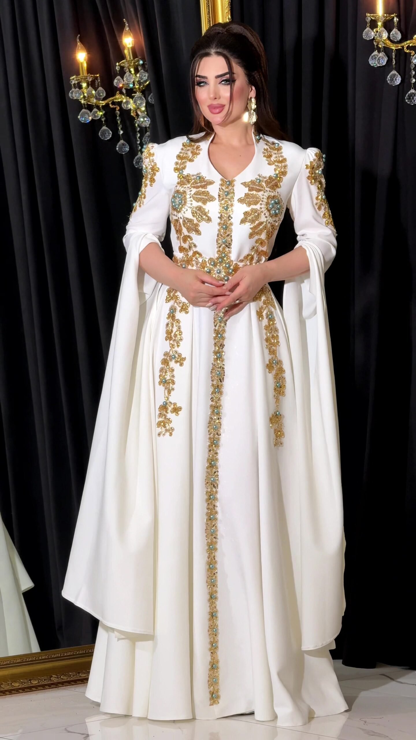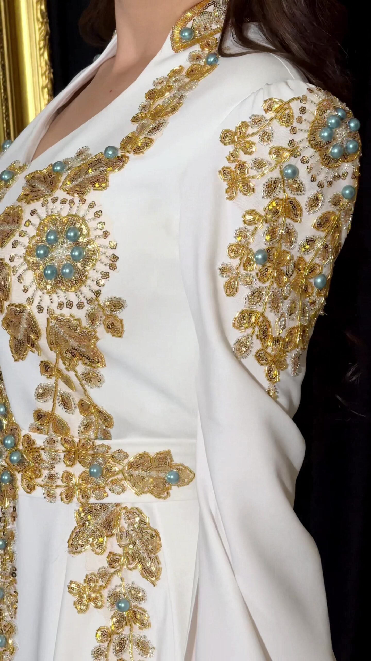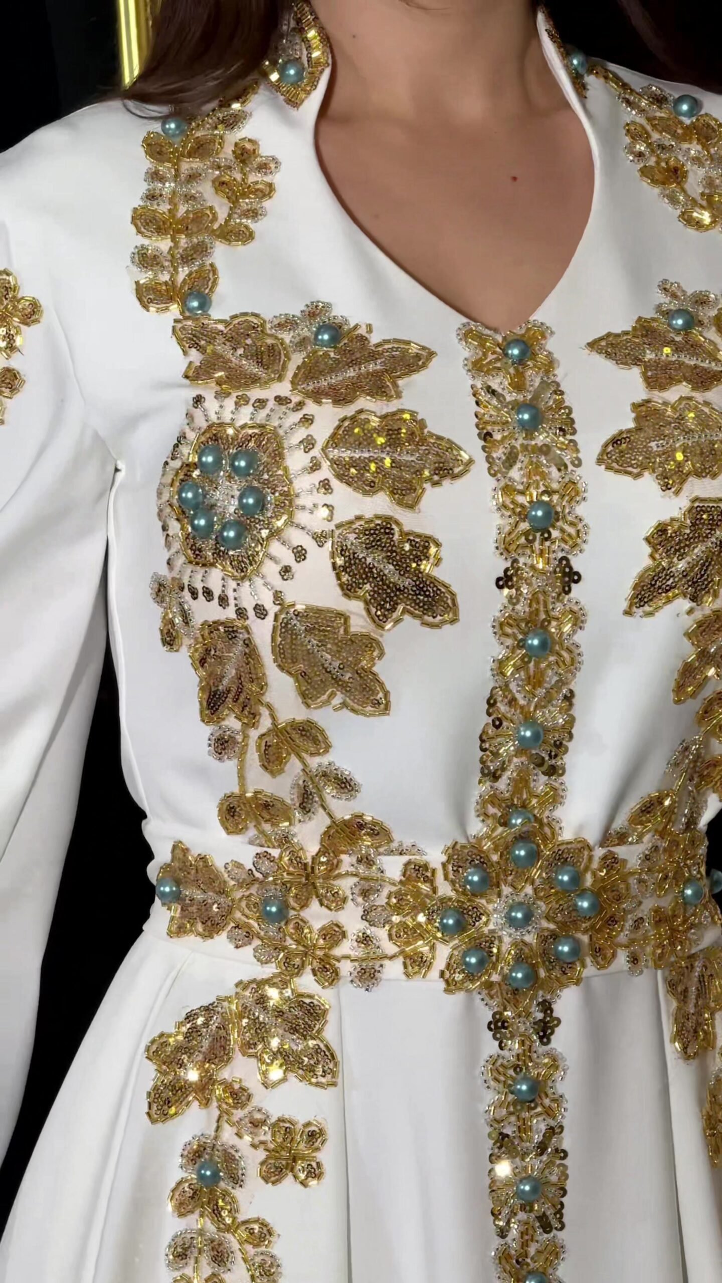 A luxurious evening dress in royal white, embellished with exquisite gold embroidery and sparkling turquoise stones, with an elegant and luxurious design that highlights the beauty of the figure and combines authenticity and sophistication.