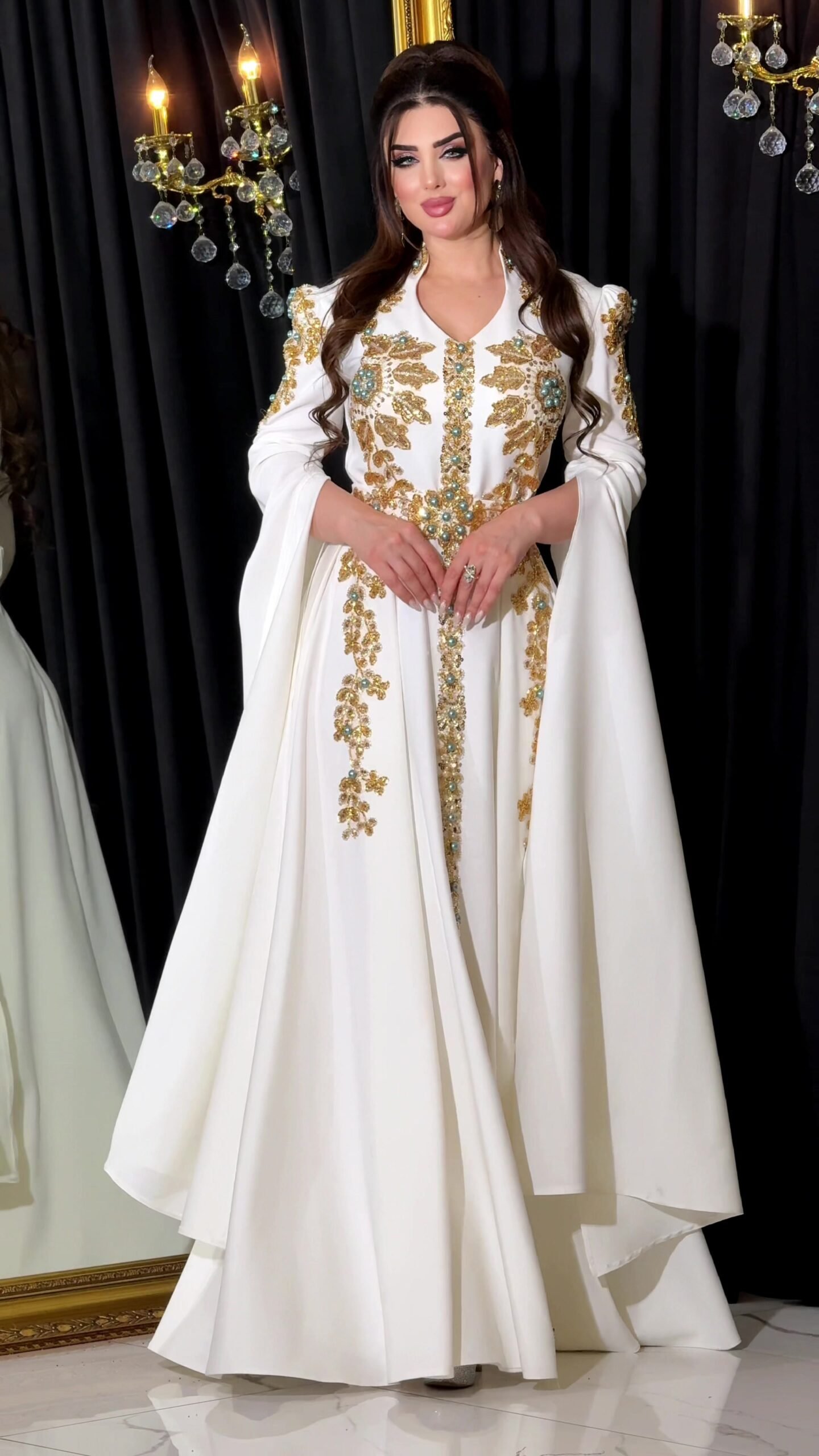 The gown’s cut is inspired by luxurious oriental fashion, with modern touches that highlight the details of the waist and shoulders, giving you an elegant look and striking confidence. The draping, luxurious fabric provides a feeling of comfort and softness throughout the evening, while the prominent embroidery offers a unique sparkle under the lights.