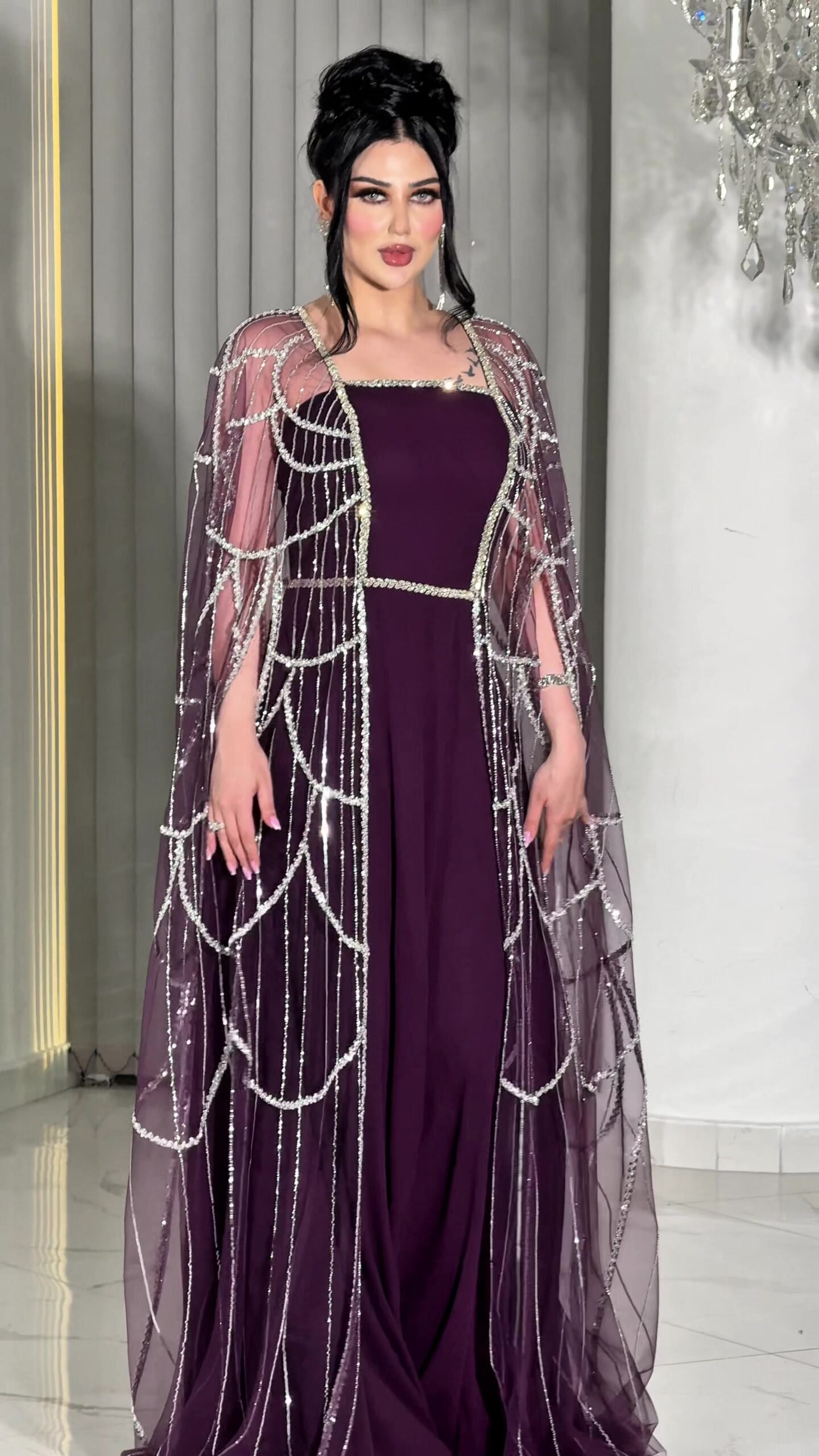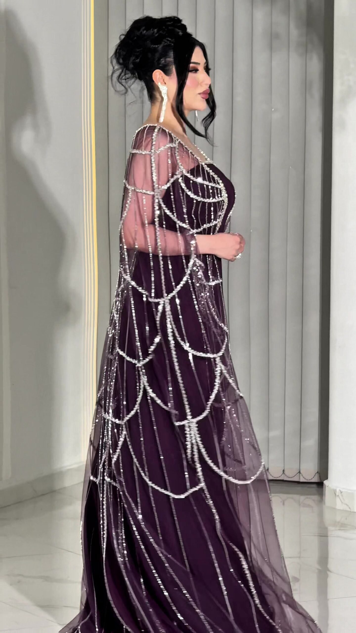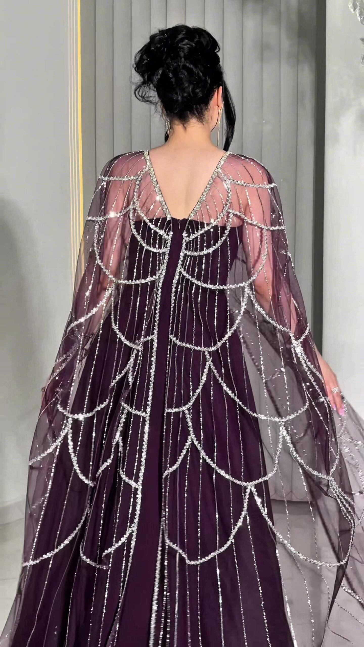 A royal evening gown that features a long, flowing design with a sheer cape fully adorned with sparkling sequin threads. The sequins are arranged in stunning geometric arches, adding an enchanting sparkle to every movement.