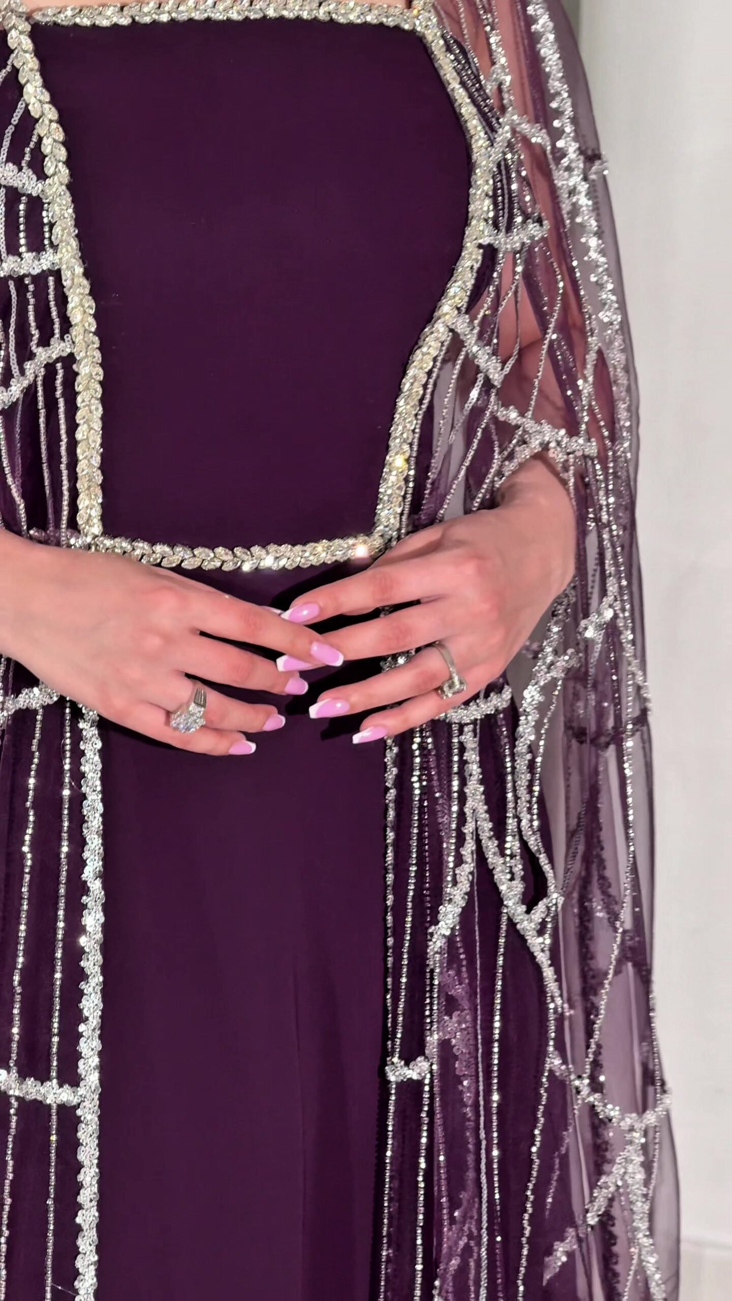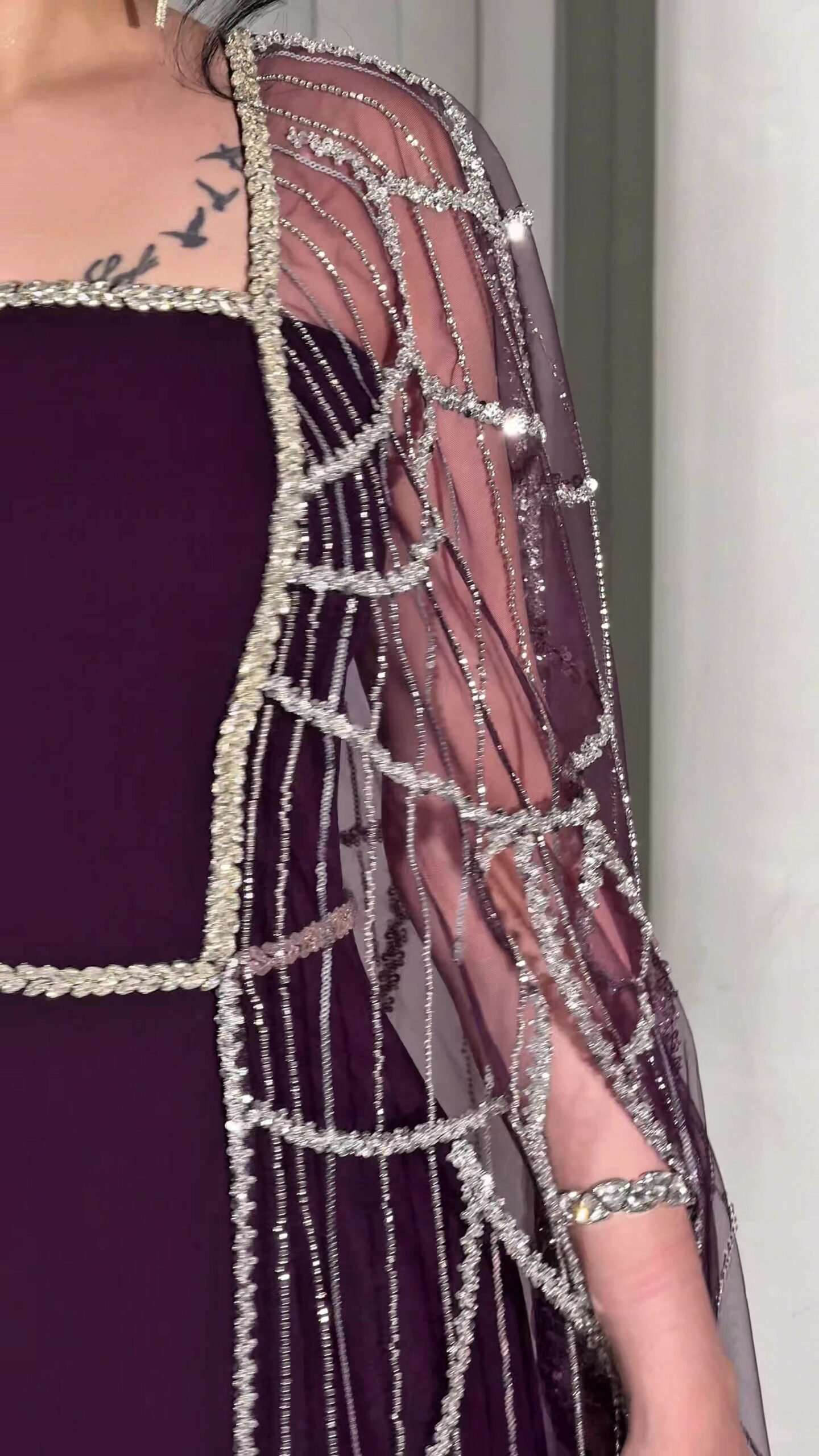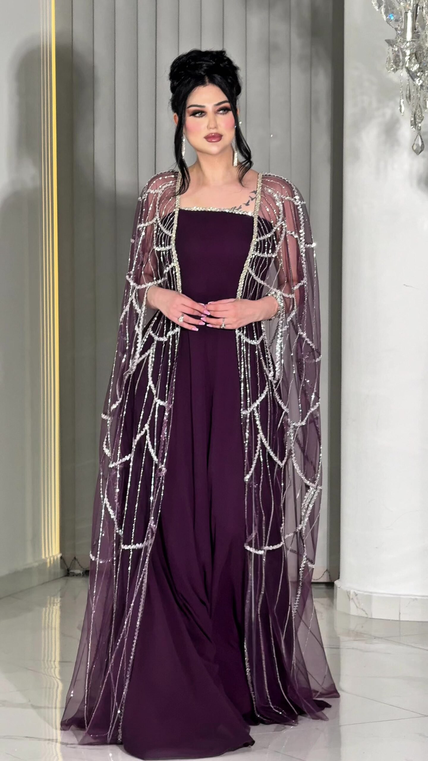 A royal evening gown that features a long, flowing design with a sheer cape fully adorned with sparkling sequin threads. The sequins are arranged in stunning geometric arches, adding an enchanting sparkle to every movement.