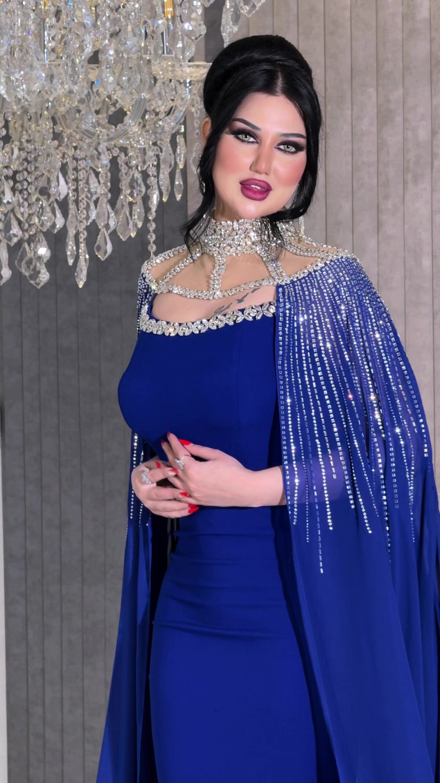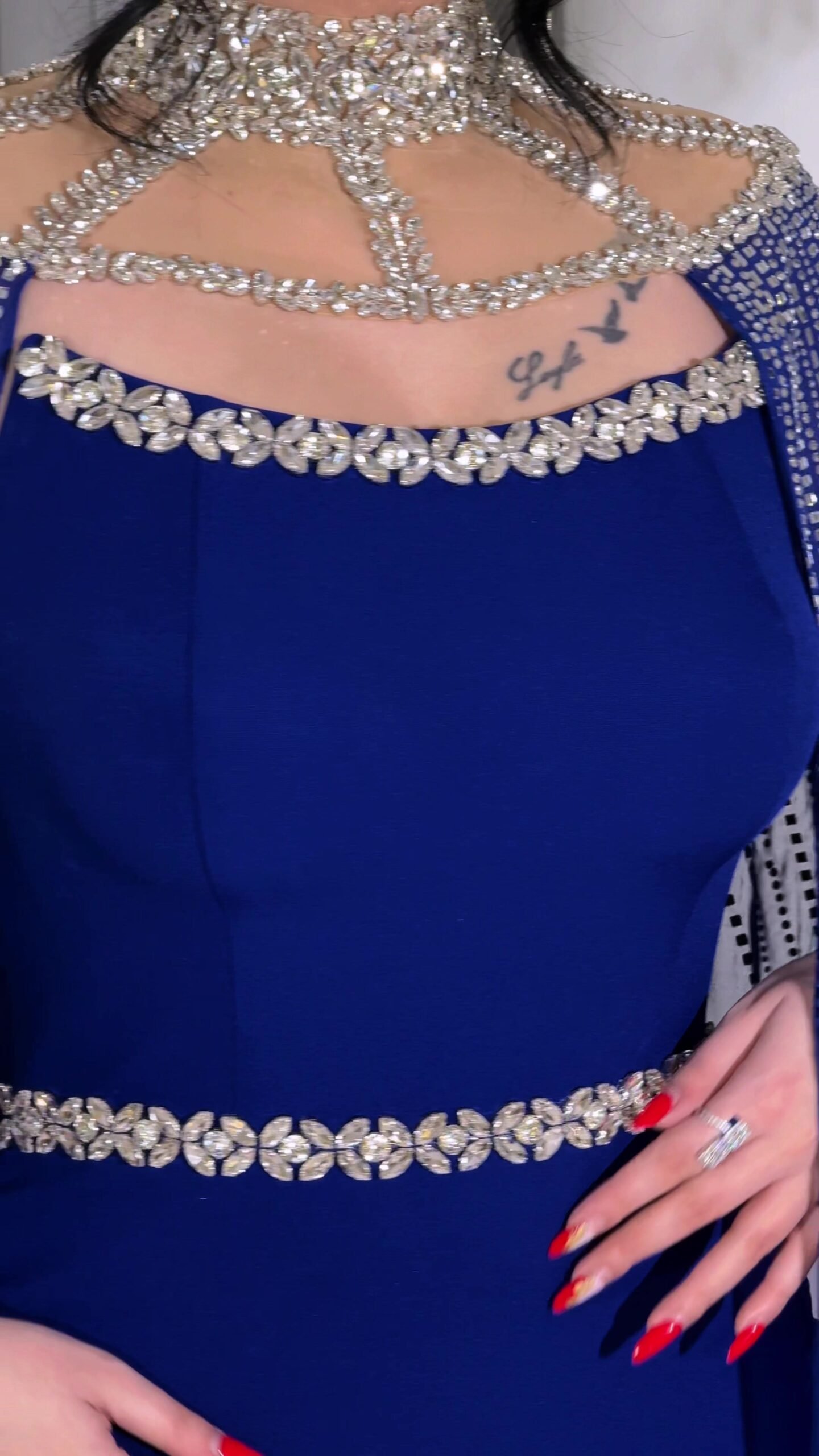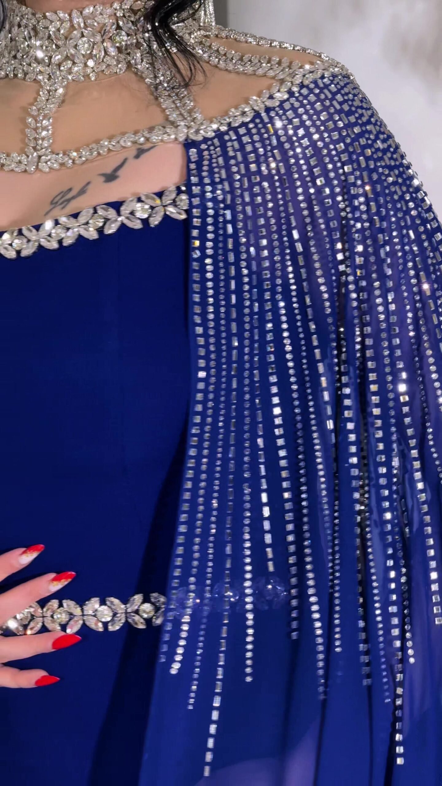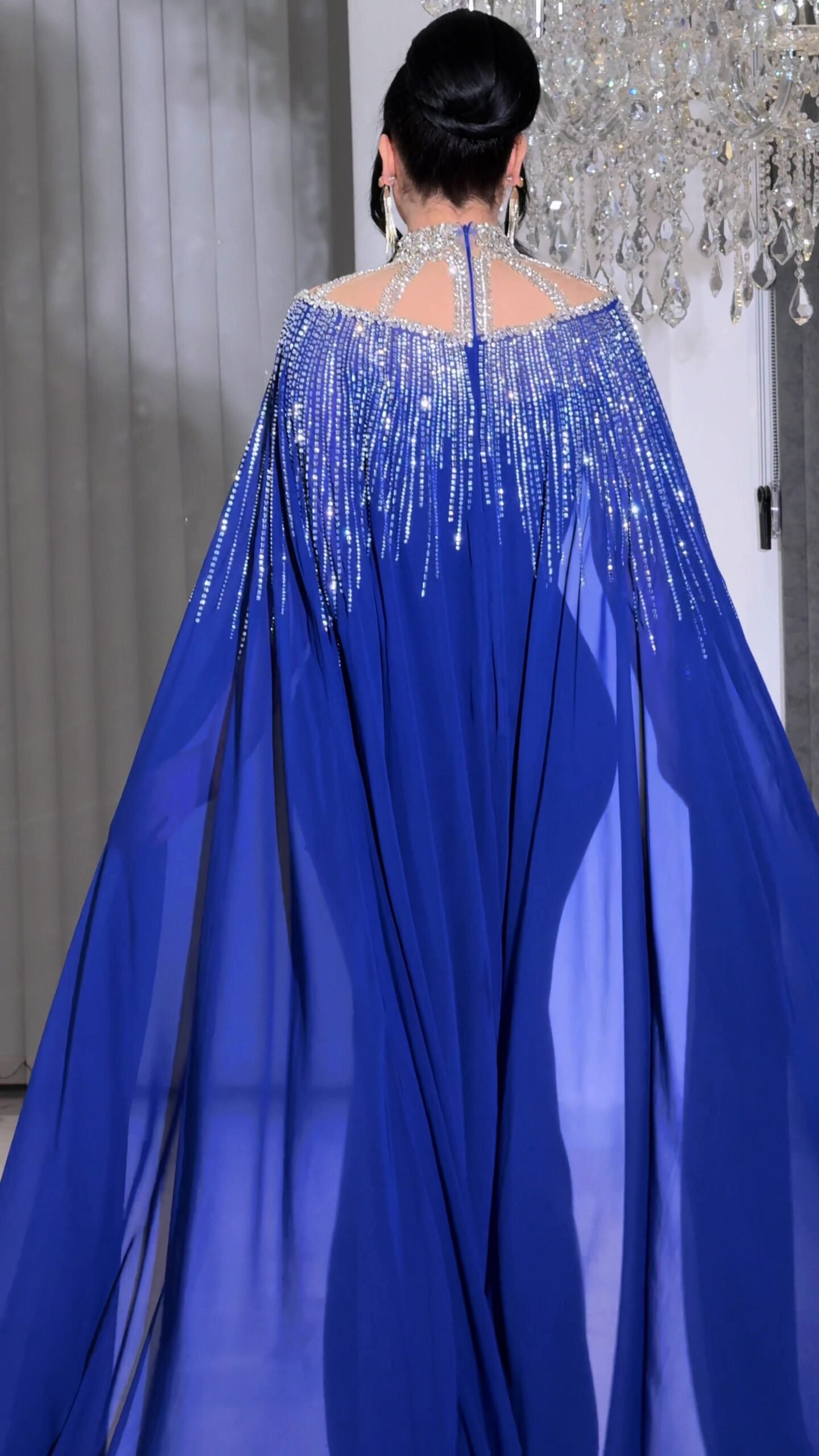 An elegant dress in a deep royal blue, crafted from a luxurious crepe fabric that drapes fluidly over the body for a sophisticated feminine look. The design features a wide chiffon cape, fully embroidered with sparkling crystal stones distributed in a cascading waterfall style, adding a touch of luxury and light to every movement.
