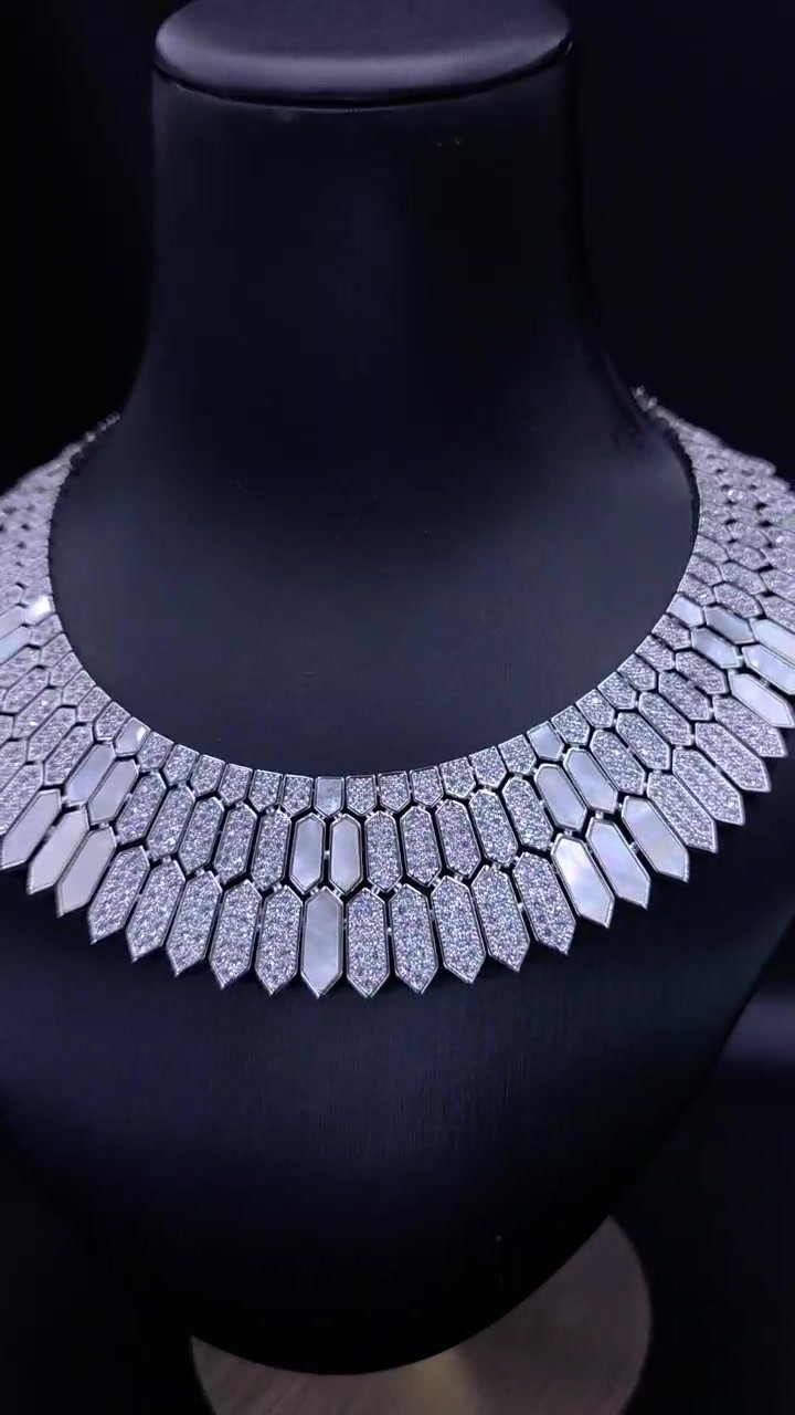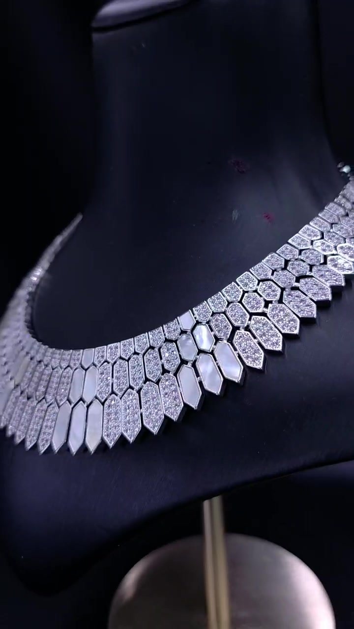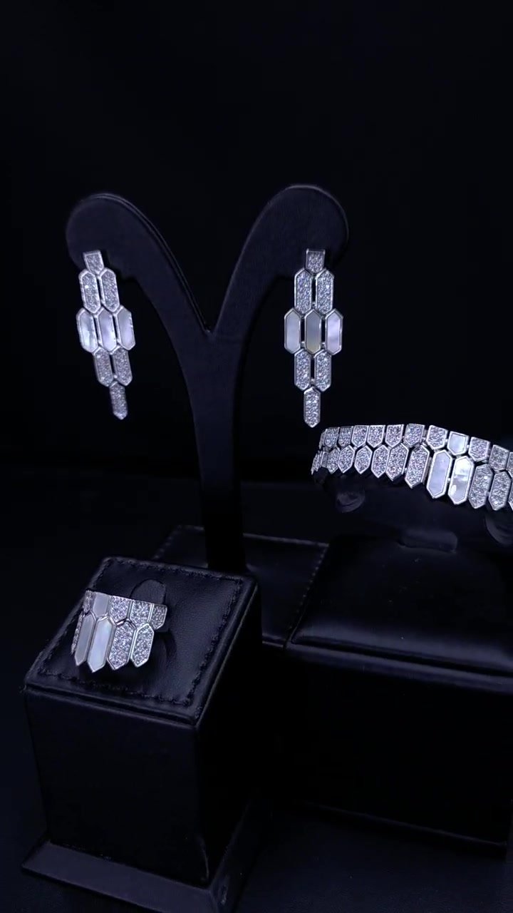 Main Description: Introduce a captivating, modern edge to your formal wear with our Art Deco Zirconia Hexagon Set. This exquisite four-piece collection is distinguished by its bold geometric design, offering a sophisticated departure from traditional jewelry styles. The centerpiece is the wide, collar-style necklace, meticulously constructed from interlocking hexagonal and trapezoid Zirconia elements. The design creates a striking, sculpted finish that elegantly defines the neckline, combining large, luminous stones with delicate micro-pavé detailing for maximum dimensionality and sparkle.