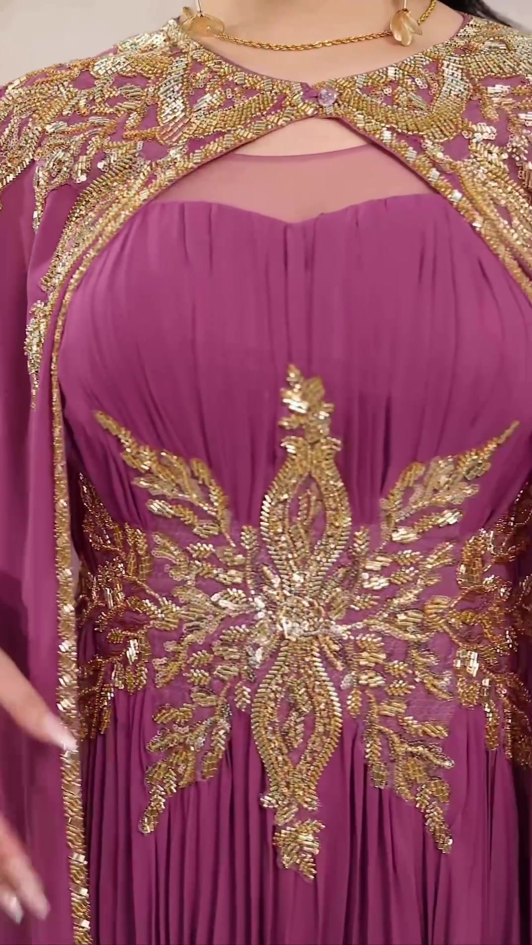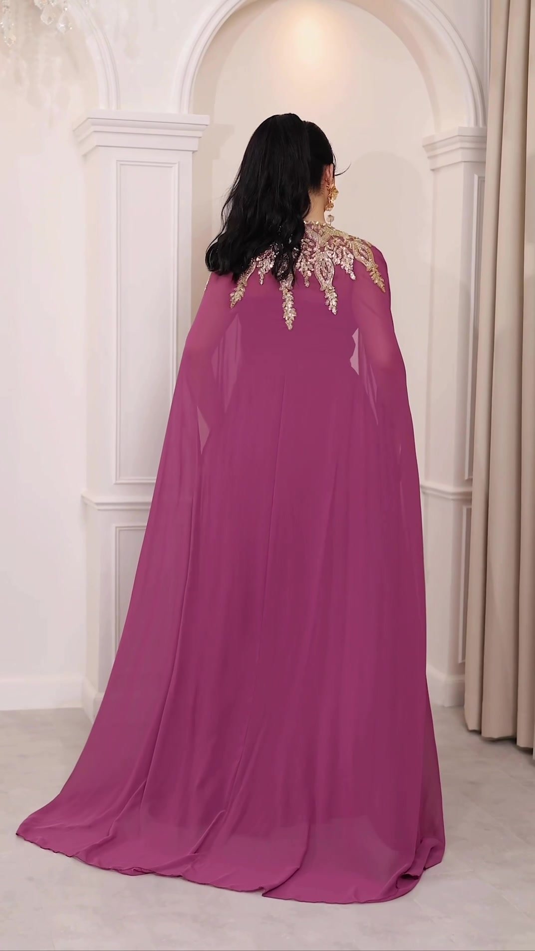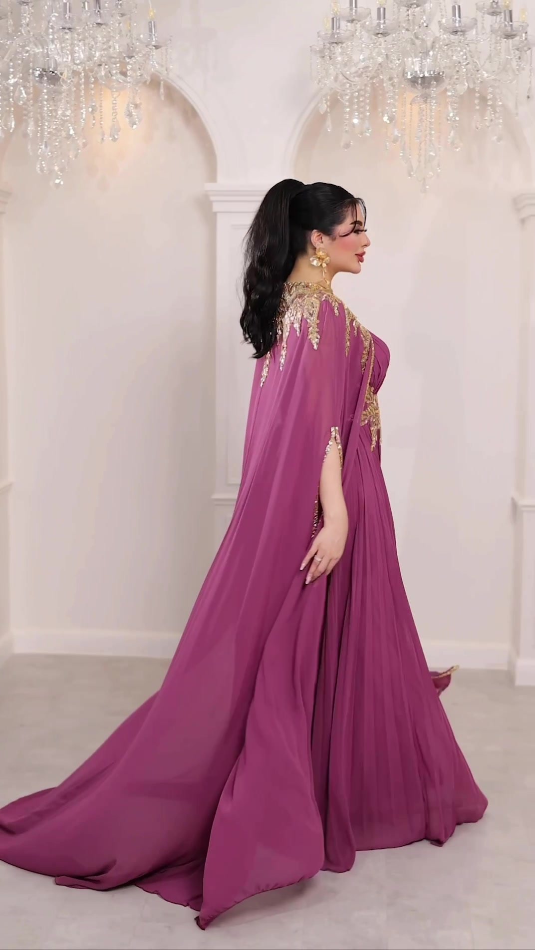 A long, pleated chiffon evening gown 🌟, featuring an attached cape with gold embroidery on the shoulders and waist. A royal look reminiscent of a Grecian goddess.