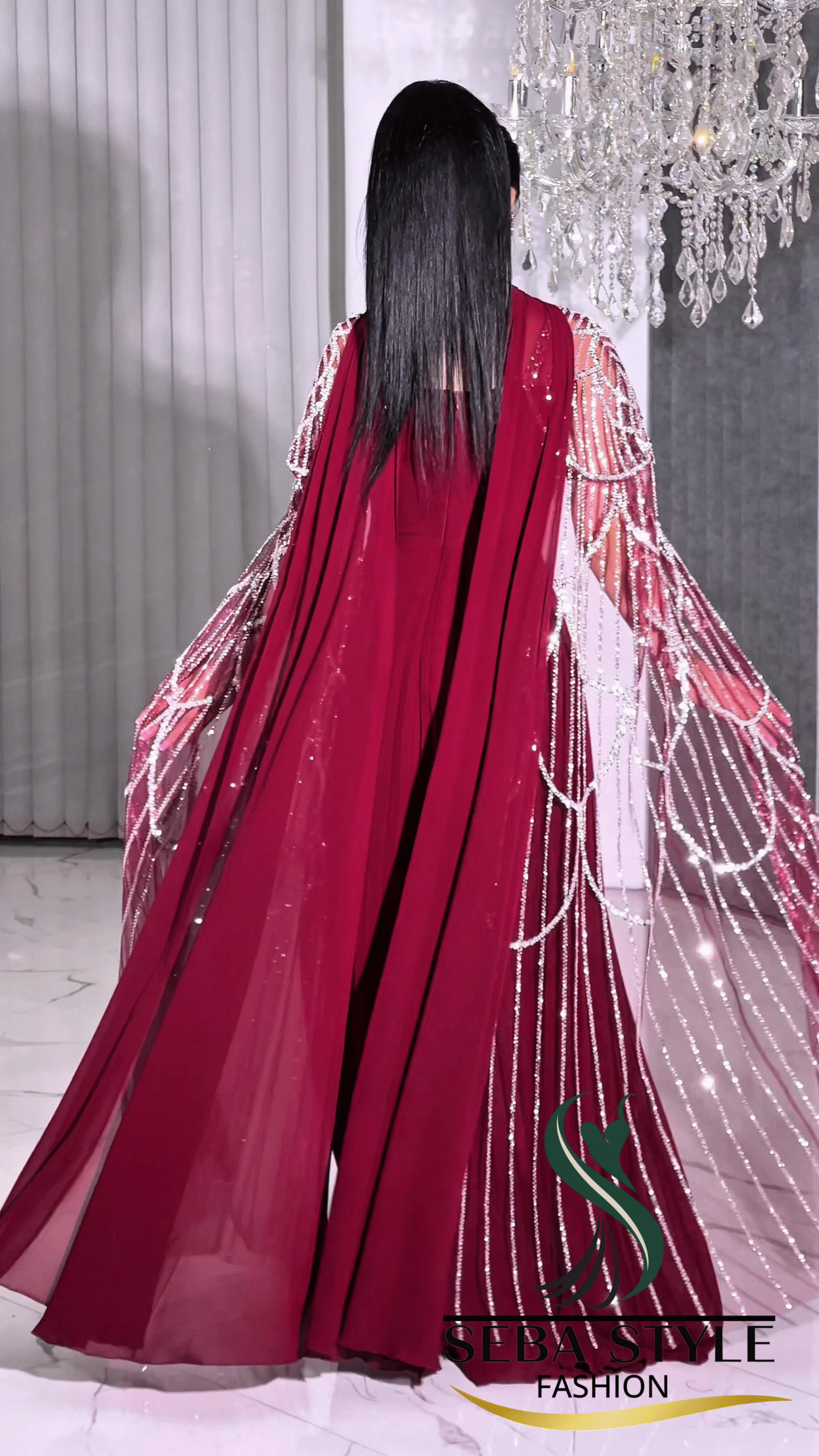 • Fully Embellished Cape: A chandelier-design cape, fully handcrafted with beads and crystals.