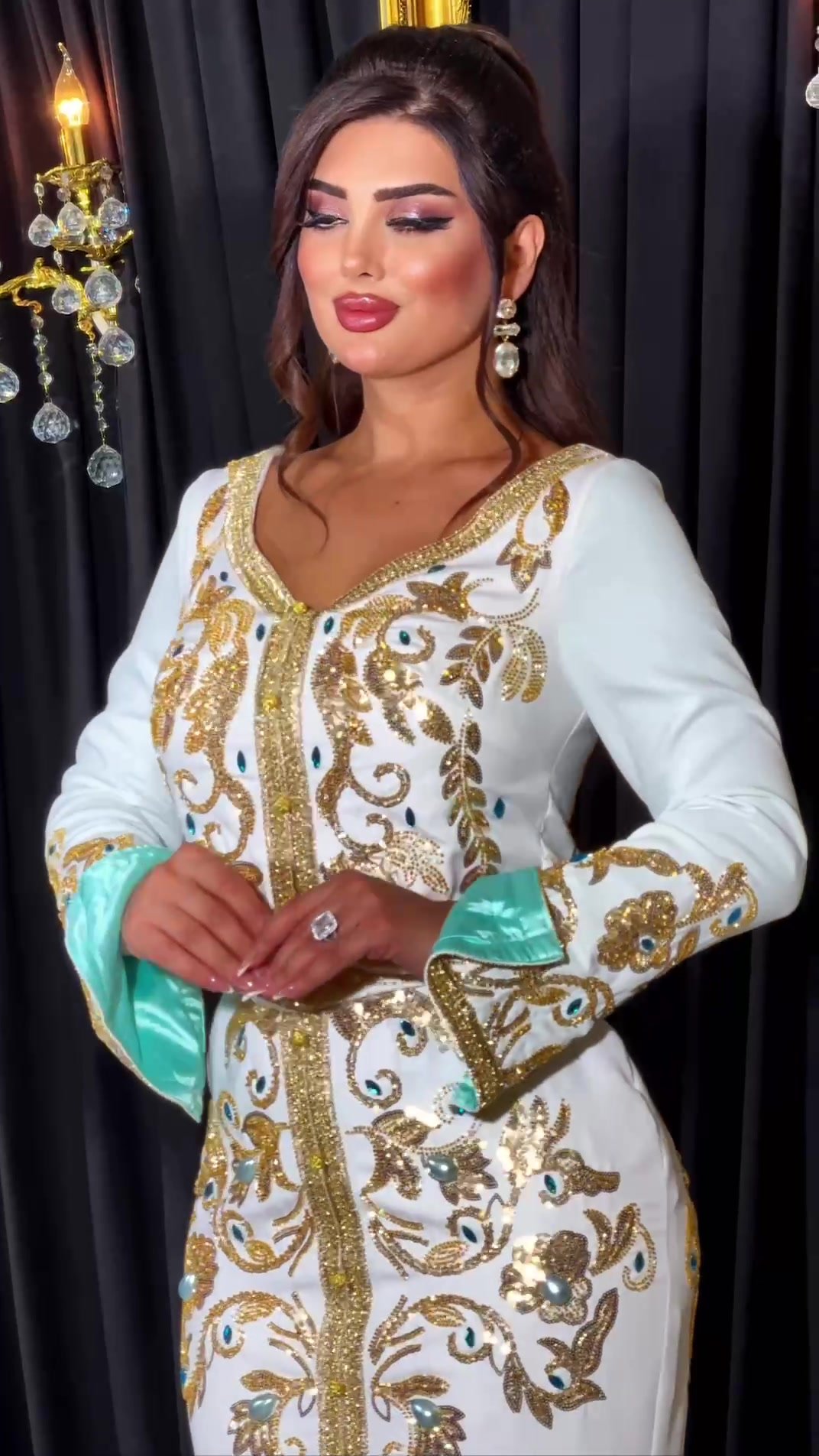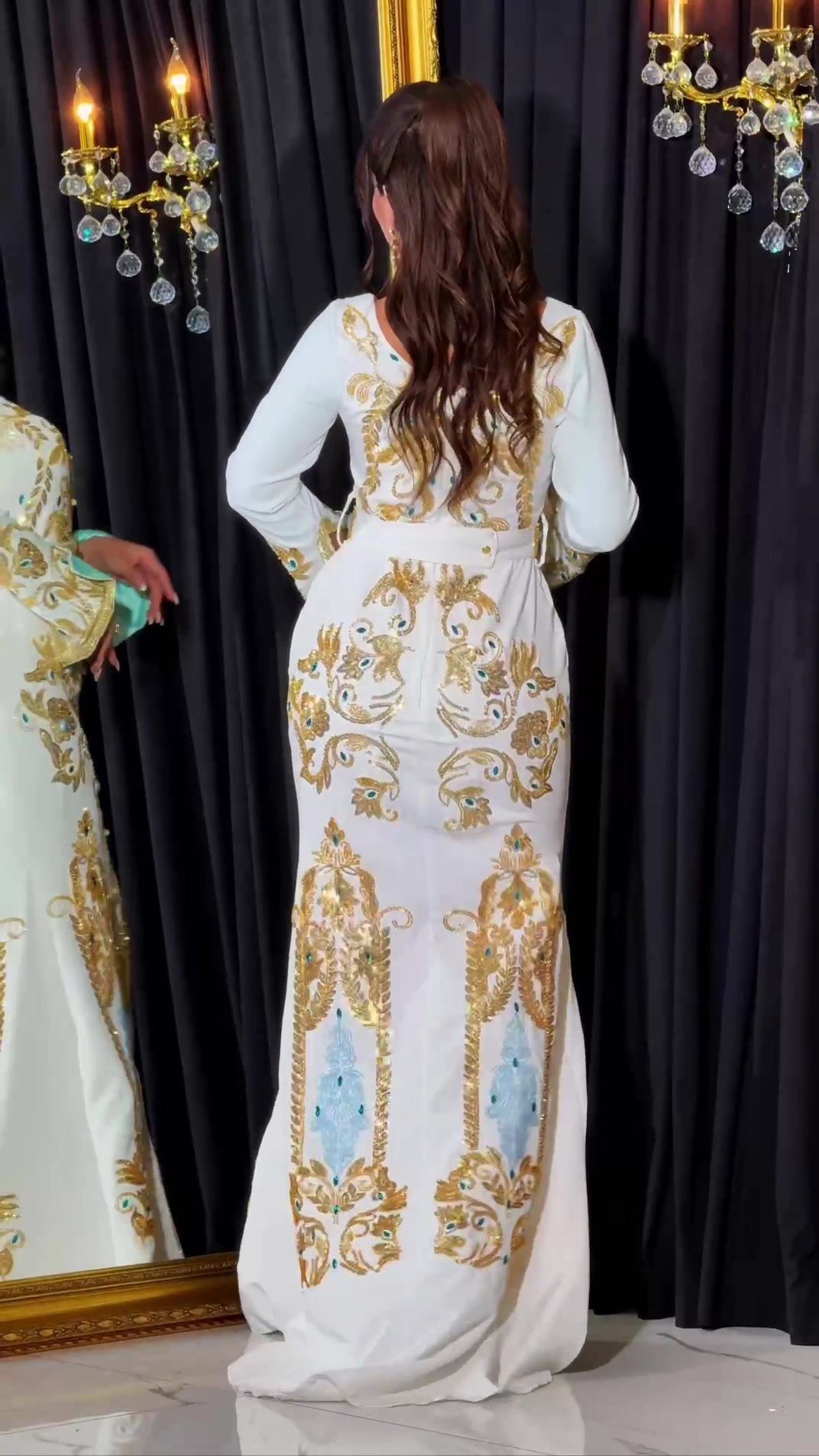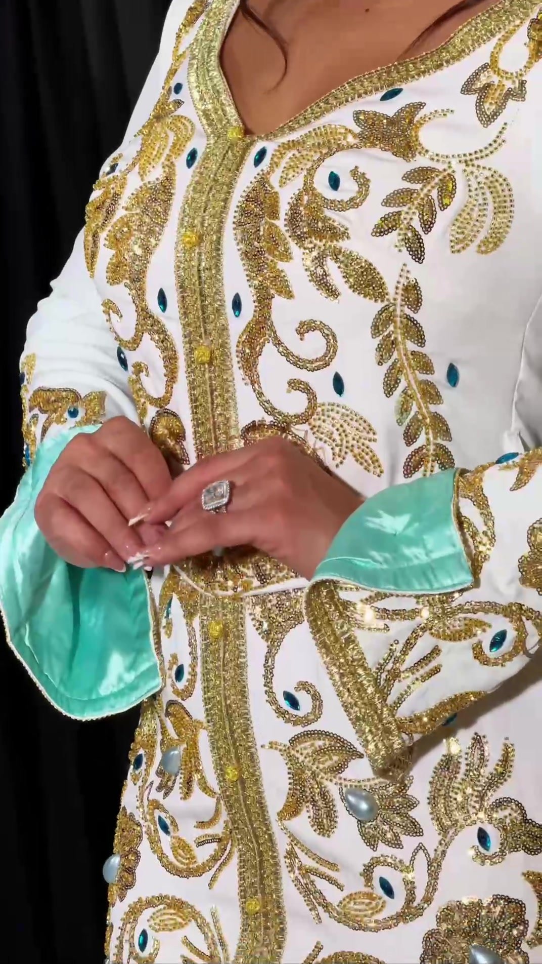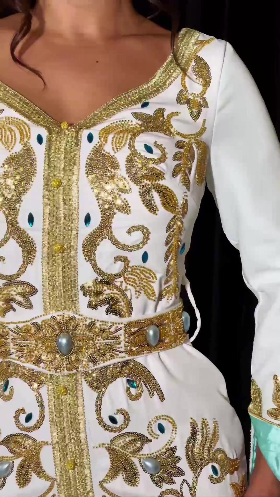 ✨ Be the epitome of elegance and distinction with this caftan that redefines traditional wear. A design that combines absolute luxury with unexpected details. Every inch of this caftan is covered in rich golden embroidery that tells a story of mastery, while pops of colored crystal and the mint-colored sleeve lining add a personal and modern touch. The fitted silhouette gives you a perfect figure, and the luxurious belt completes the elegant look. A perfect piece to be the star of any party or grand occasion.